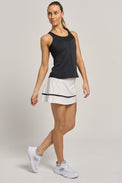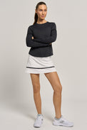 The Banded Arena Skort is another staff favorite. The front of the skort is more of an a-line but the back and the sides offer lots of volume. The contrast panels near the hem are two tone. This is a body skimming fit.