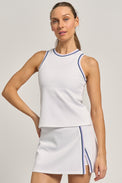 Step onto the court in style with the Varsity Tank 2.0 — the sister to the Varsity Tank offering a subtle increase in length and slightly less fitted. This performance‑driven top blends athletic style with modern edge. Crafted from moisture‑wicking, quick‑dry fabric with four‑way stretch, this fitted 21" tank moves with you through every serve, swing, and sprint.