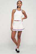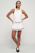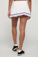 The Club Skort is a best seller. It has the classic pleats all around with two contrast stripes near the hem. This skort is designed in a lightweight stretch woven and tonal knit fabric for the waistband and undershorts. It is a body skimming fit.