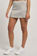 The Linear Skort is designed in a lightweight stretch woven with knit waistband and undershorts. The stretch woven offers a more structured body skimming fit with less draping & movement.