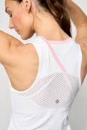 The LIJA Peek Tank is your go‑to performance top with a more classic length and silhouette. A flattering scoop neckline with contrast binding frames the face. The contrast binding continues to the upper back with an asymmetrical seam feature. The mid-back of the tennis tank boasts a tonal mesh panel for a bold, breathable twist.