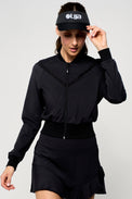 LIJA's Revenge Jacket is a slightly cropped silhouette, at 20" in length, for a modern, athletic look. The double knit fabric gives it a more structured look with superior comfort. It boasts a sleek baseball collar with a full-length zipper for easy wear. There are v-shaped overlay mesh panels at the front and back of the jacket for added visual texture. The fit is more body skimming for a more sleek silhouette. It fits true to size and is a slimmer body skimming fit. Both models are 5'10" and wearing size small.