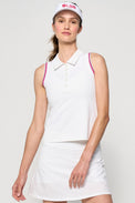 • Four button placket • Self collar • Striped rib on armholes • Shoulders have laser cut perforated fabric detail • Slim racerback • 22 1/2" length• Body Skimming fit