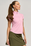 This mock neck women's polo is designed with a flattering body-skimming fit, and offers complete comfort and freedom of movement—plus enough room to layer a long sleeve underneath on cooler days. The 2" mock neck and 9" front zipper, finished with a signature LIJA pull, add a polished athletic touch. At 22½" in length, it’s perfectly proportioned to wear tucked or untucked. Crafted for performance and protection, this classic zip mock also features UPF 50+ sun protection, keeping you confident and covered wherever your day takes you. Our model is 5'10" with a 33" bust and 25" waist. She is wearing size small.