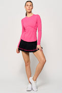 Serve up style and performance in the Status Skort, a modern take on a classic women’s tennis skort. Designed with slim pleats and contrast stripes near the hem, it brings a touch of heritage flair to your active wardrobe. The lightweight stretch-woven fabric moves effortlessly with you, while the performance knit waistband and built-in undershorts deliver lasting comfort and support. This athletic skort blends timeless design with performance functionality — your go-to piece for on-court confidence and off-court style.