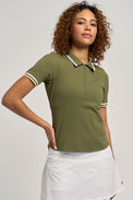 Elevate your golf wardrobe with the Tee Polo, a refined women’s polo crafted for performance and style. The zip‑collar placket and contrast trim at the collar add a modern, athletic edge, while the striped rib armholes bring sporty heritage charm. Designed in a smooth micro-pique fabric, this polo brings comfort, functionality and style to your game.