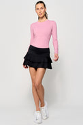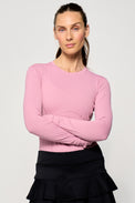 This functional long sleeve top features a flattering 23" length and a body-skimming fit that effortlessly enhances your natural shape. Thoughtfully designed princess seams at the front and back, along with an underbust seam, create a beautifully feminine silhouette. Practical thumbhole openings at the cuffs add an extra layer of comfort and functionality, making this top ideal for active days and layering alike.