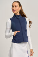 Tonal overlay panels in our stretch-woven NEVO fabric add subtle visual and textural interest while reinforcing performance functionality. Finished with a full-length front zipper, a 22½" body length, and a 2¼" stand-up collar, this vest offers both coverage and comfort. Two angled front zip pockets provide secure storage, making the Training Vest a versatile essential for training, travel, and everyday life. This vest follows the contours of your body and has a body skimming fit. The model is 5'9" with a 34" bust and 25" waist. She is wearing a size small.