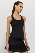 The Upside Tank has a scoop neckline with a tonal mesh inset panel at the upper bust and wraps to the upper back. The wide straps meet together at the back in a high V racerback style. It has a curved hemline and is a body skimming fit.