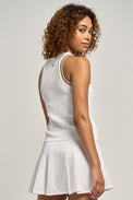Step onto the court in style with the Varsity Tank 2.0 — the sister to the Varsity Tank offering a subtle increase in length and slightly less fitted. This performance‑driven top blends athletic style with modern edge. Crafted from moisture‑wicking, quick‑dry fabric with four‑way stretch, this fitted 21" tank moves with you through every serve, swing, and sprint.